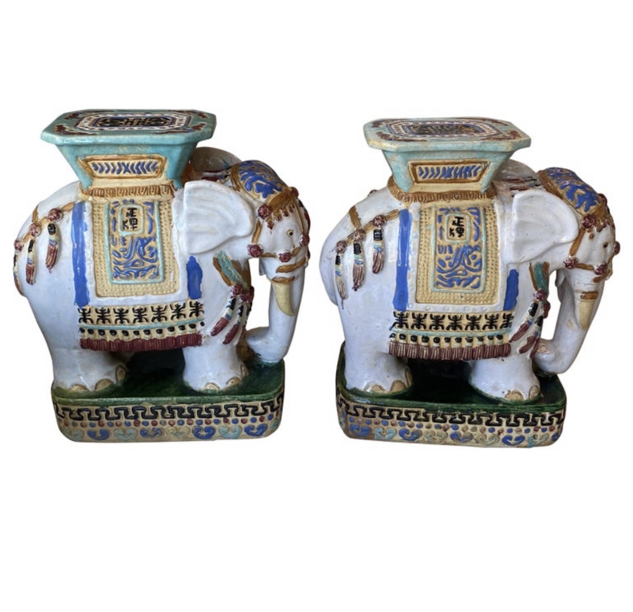 SOLD Vintage Pair Large Glazed Elephant Garden Stools Stands Drink Tables Seats