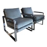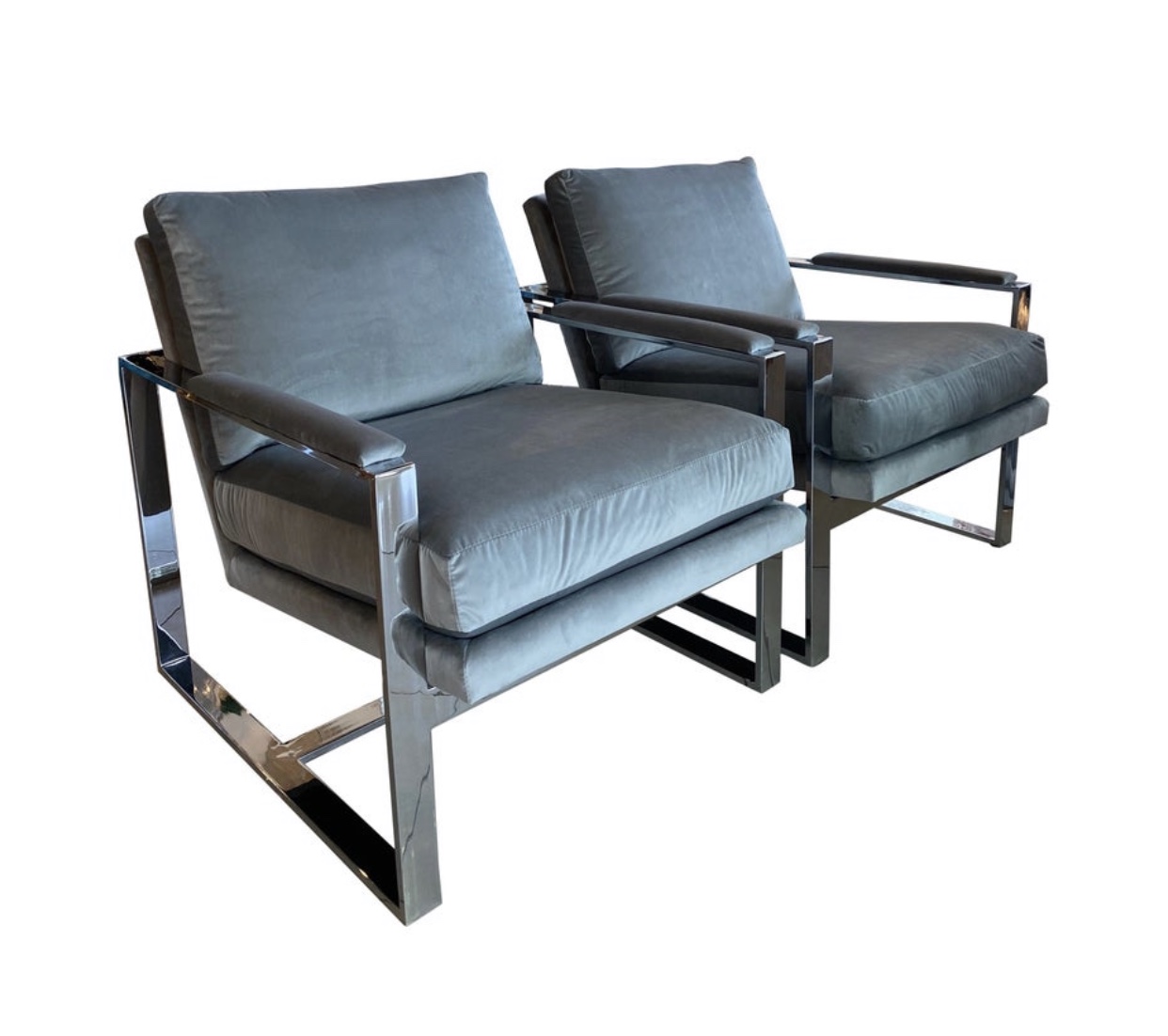 SOLD Vintage Pair Milo Baughman Chrome Cube Arm Chairs Newly Upholstered Grey Velvet