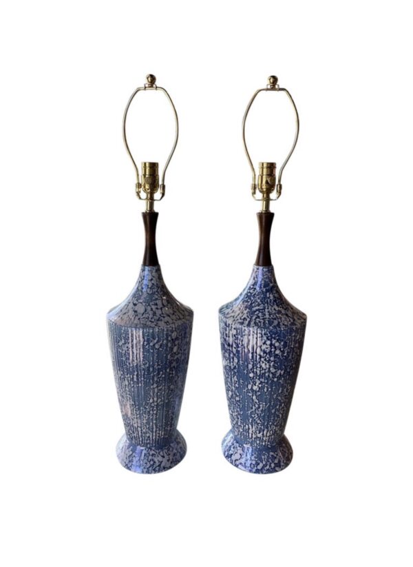 Lovely vintage pair of mid century modern blue and white ceramic table lamps with original wood neck. No chips or breaks. These have been newly wired and have all new brass hardware. Height to Socket 24″