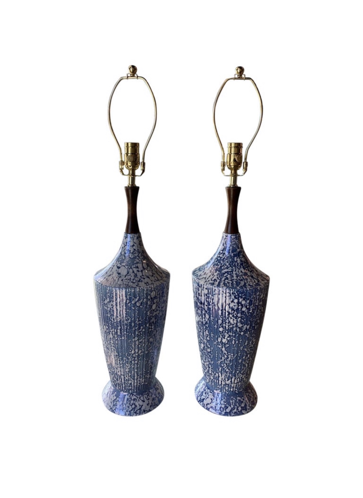 SOLD Vintage Pair of Blue and White Ceramic Table Lamps Mid Century Modern Rewired