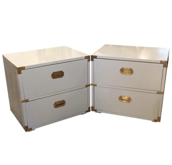 SOLD Vintage Pair of Lane Campaign Nightstands Chests Powder Blue Lacquered Brass