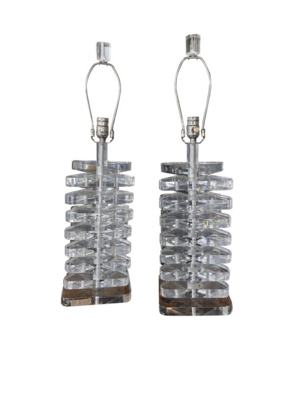 Large pair of vintage stacked lucite lamps. These have great size and weight to them. Newly wired. All new chrome hardware. Height to socket 21.5