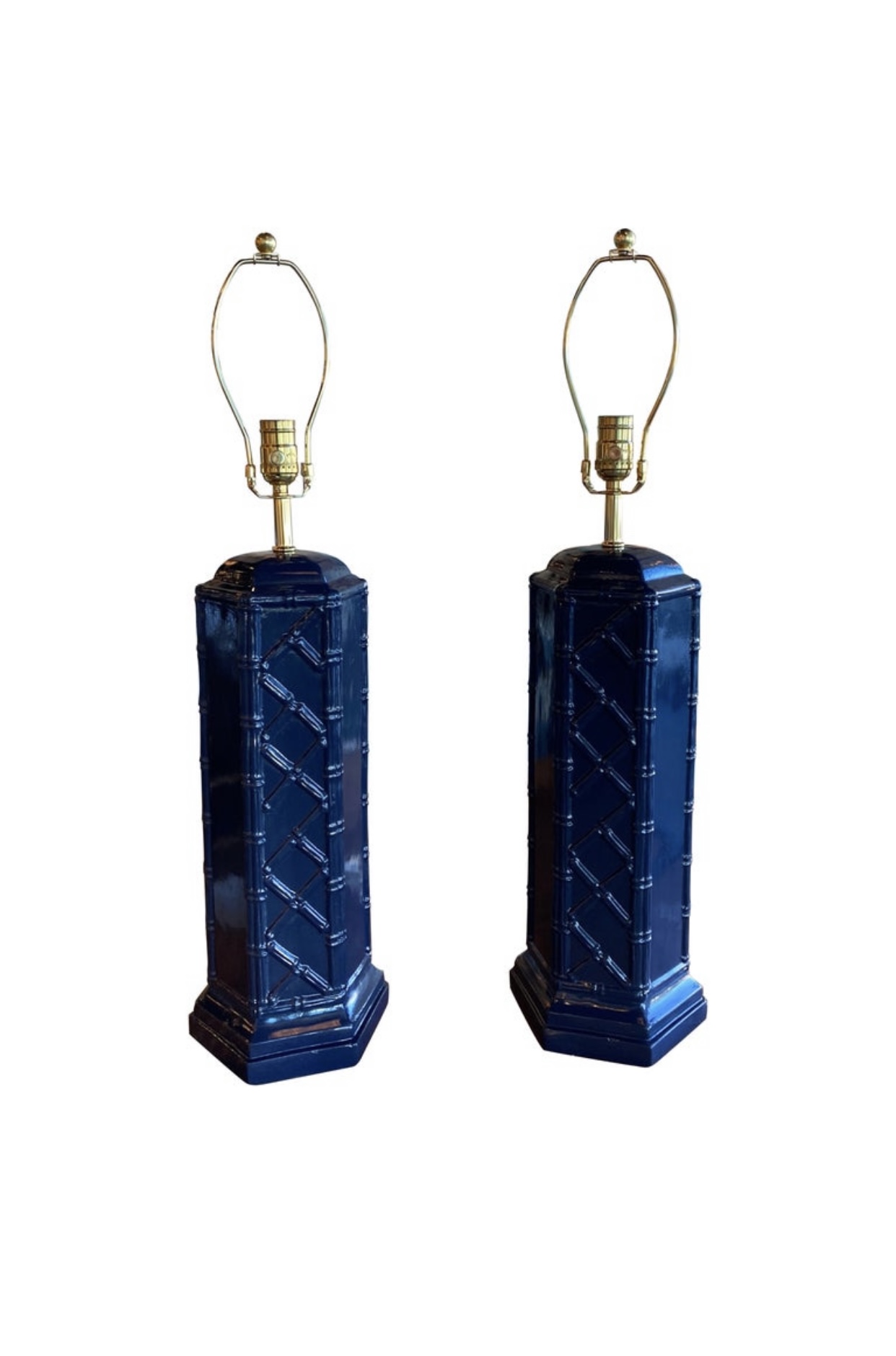 Vintage pair of Chinese chippendale navy blue faux bamboo ceramic table lamps. No chips or breaks. Newly wired with new brass hardware and 3 way sockets. Dimensions 23.5 H to socket x 30 H to finial x 7 D x 8 W