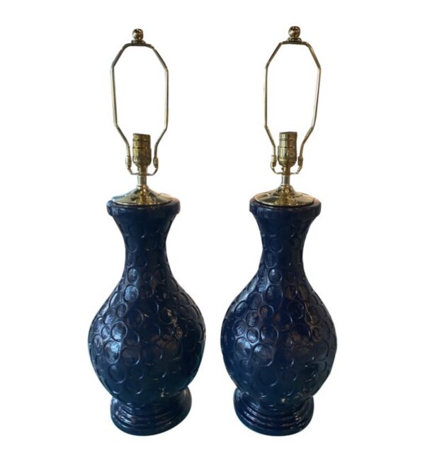 Lovely pair of plaster lamps in navy blue. Circle motif. No chips or breaks. Newly wired and all new brass hardware with 3 way sockets. Measures: 23.5 H to socket x 30 H to finial x 10 D.