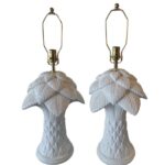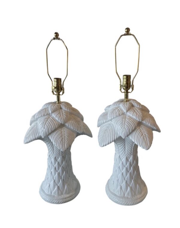 SOLD Vintage Pair of Plaster White Lacquered Palm Tree Table Lamps Newly Wired Brass