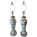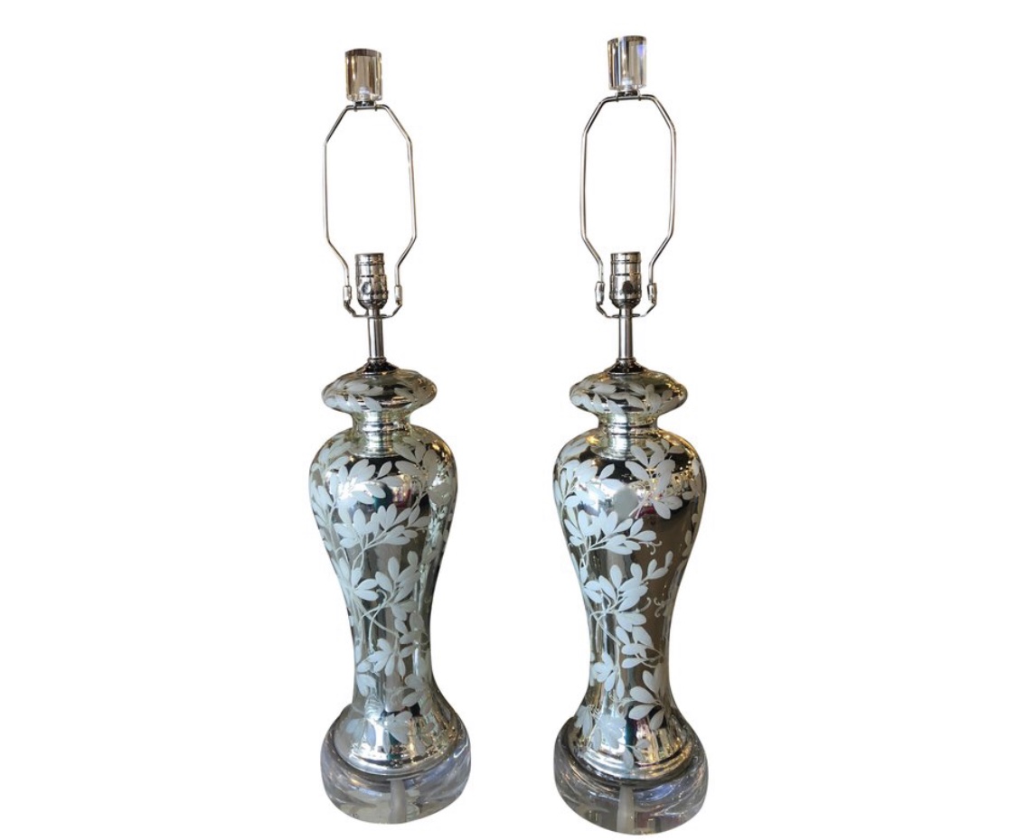SOLD Vintage Pair of Silver Mercury Glass Table Lamps Chinoiserie Floral Lucite Chrome