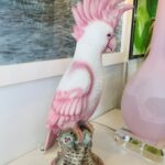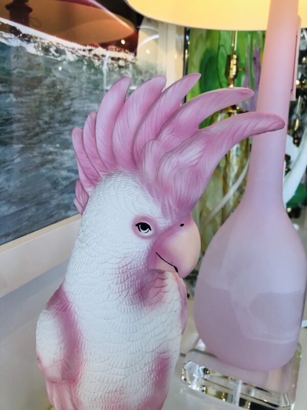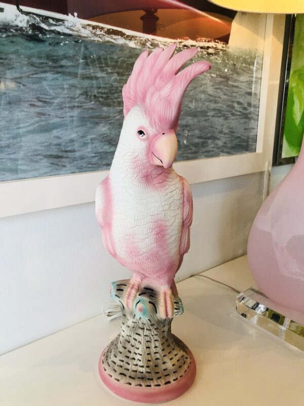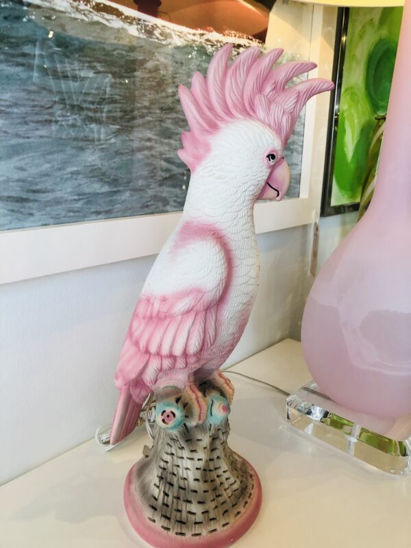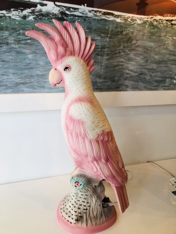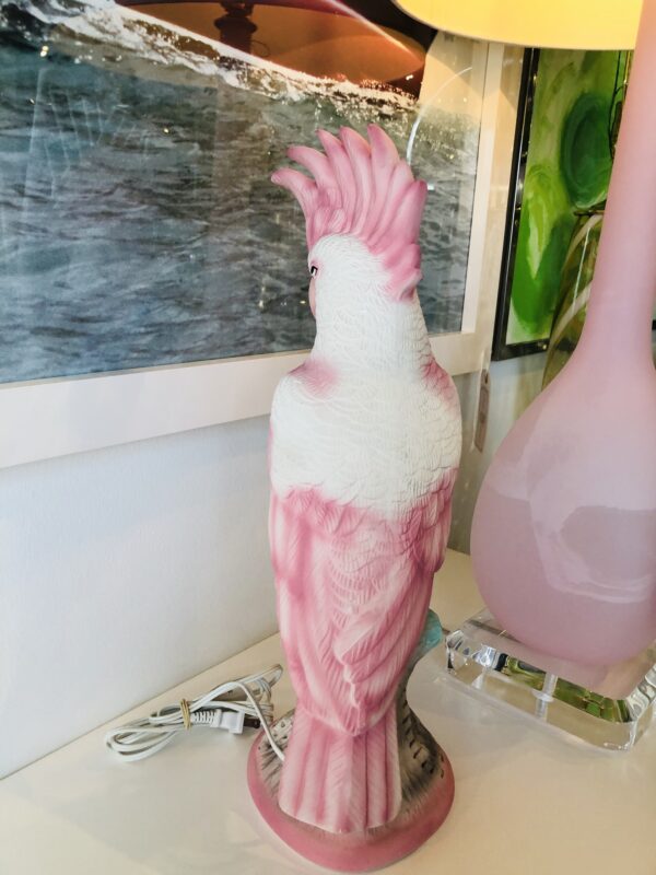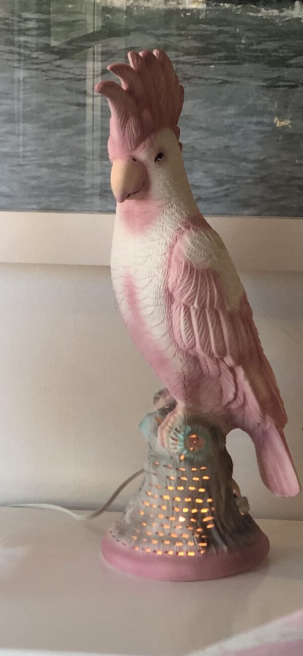 Lovely vintage pink parrot, cockatoo bird table lamp. Gives a soft glow on the bottom base (pictured). Perfect as a nightlight or soft light. No chips or breaks.