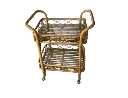 SOLD Vintage Rattan Bar Cart With 2 Glass Shelves