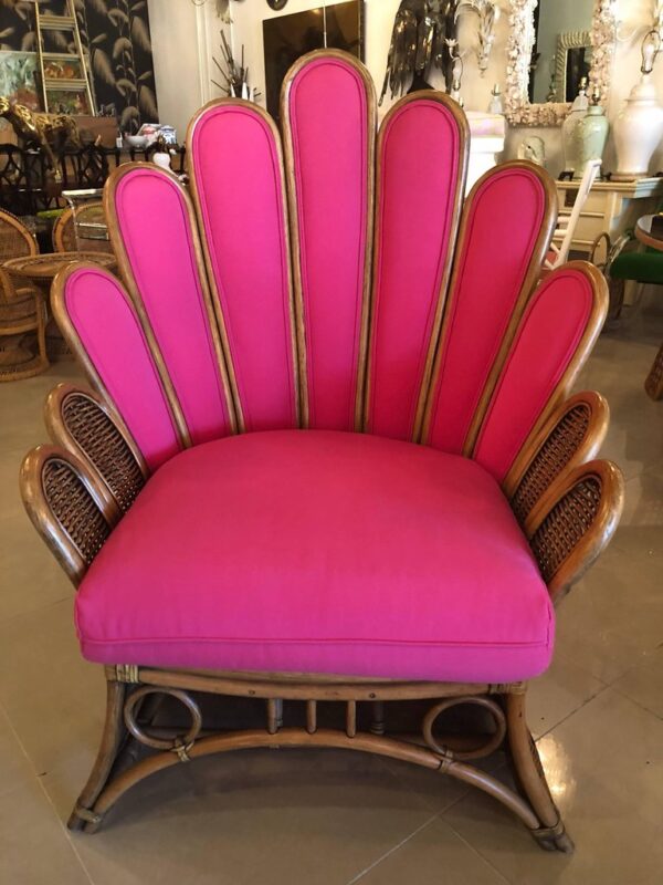 Vintage newly upholstered in an indoor/outdoor pink Sunbrella fabric, rattan and wicker peacock fanback armchair with matching footstool ottoman.