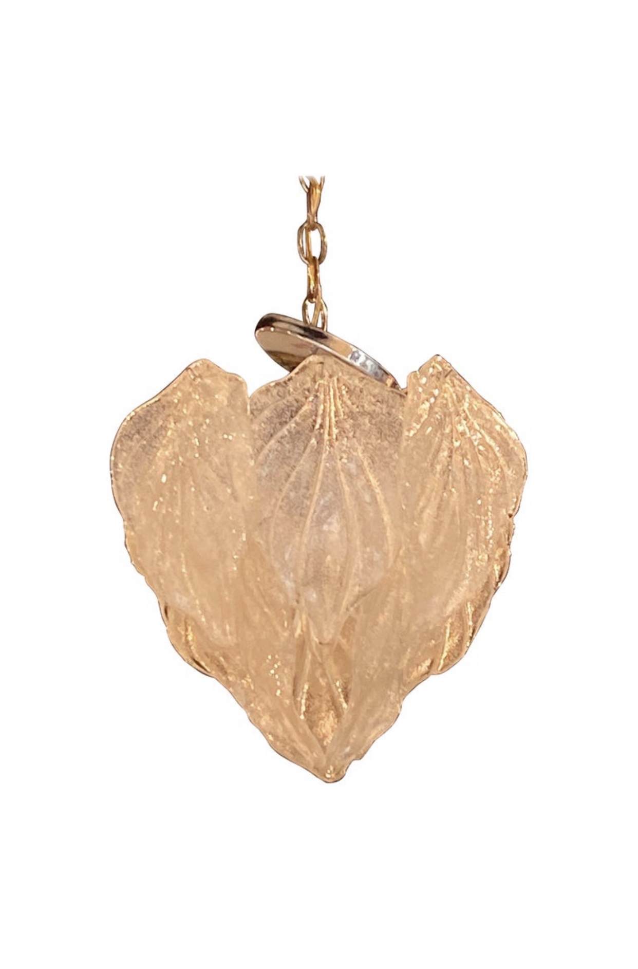 Lovely vintage small Murano Mazzega by Carlo Nason leaf chandelier. Each leaf looks like it has spun pieces of sugar sprinkled on. No chips or breaks too leaves. Size is of chandelier only since the chain is adjustable. Comes with original ceiling cap and chain. Larger matching chandelier is also available. holds 5 bulbs. Size 14 H x 13 D.