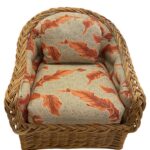 Lovely vintage wicker braided arm lounge chair by Wicker Works (sticker is present on chair). No damage to wicker. Lovely tropical leaf upholstery.