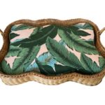 Vintage wicker basket with custom coral pink tropical leaf fabric. New foam insert with zipper, indoor/outdoor fabric for durability. Larger size available.
