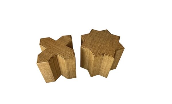 Vintage 1970s pair of Vivai Del Sud woven cane & rattan tables. These can be used separate or together as an interlocking puzzle. Theses can be used as side, end, drink tables or even a coffee cocktail table. No damage or defects. Star table measures 19.25 D x 16 H and X table measures 13.75 D x 16 H.