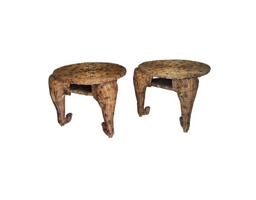 SOLD Vintage Pair of Elephant Wicker Rattan End Side Tables Marble Glass Eyes