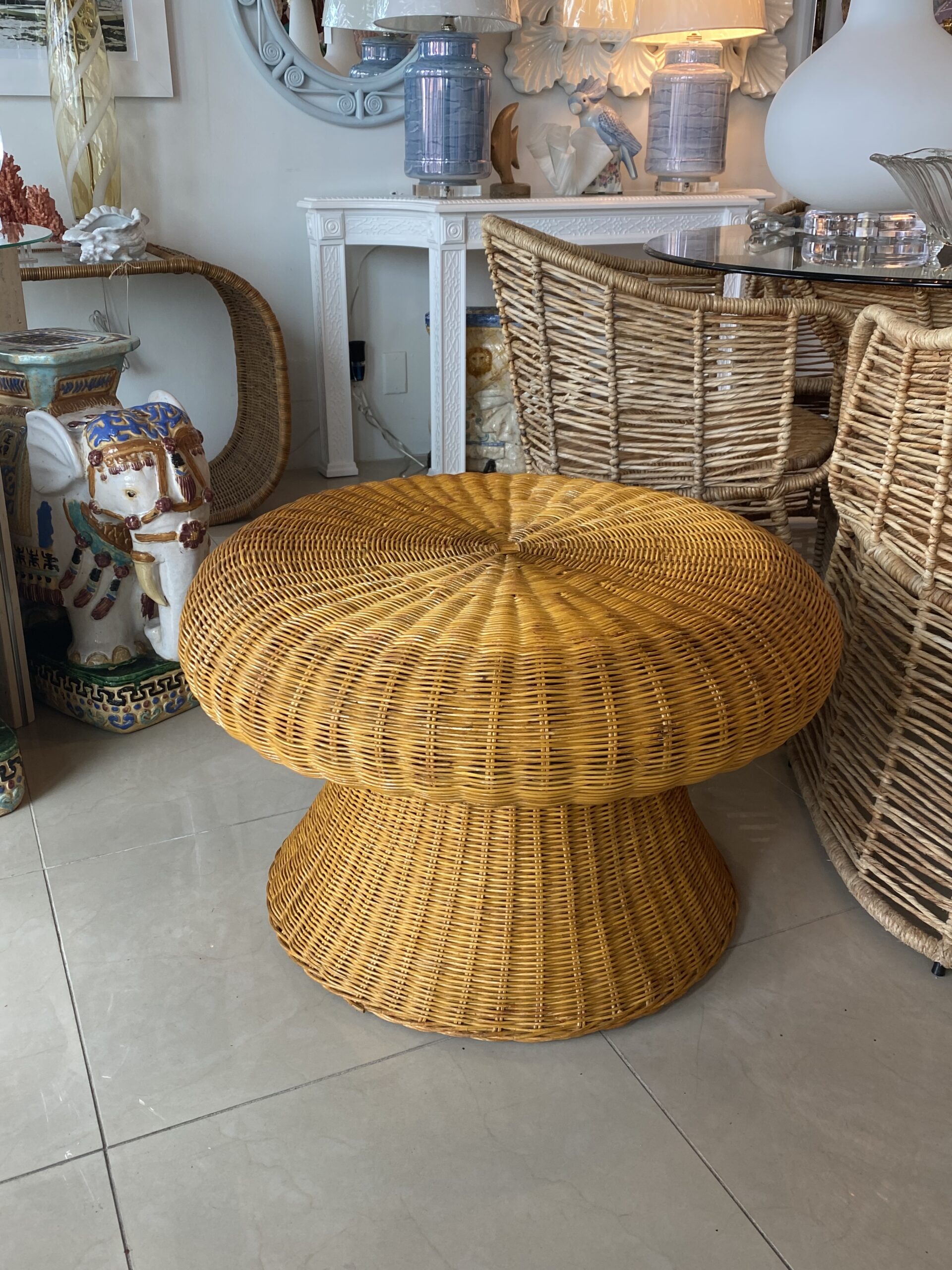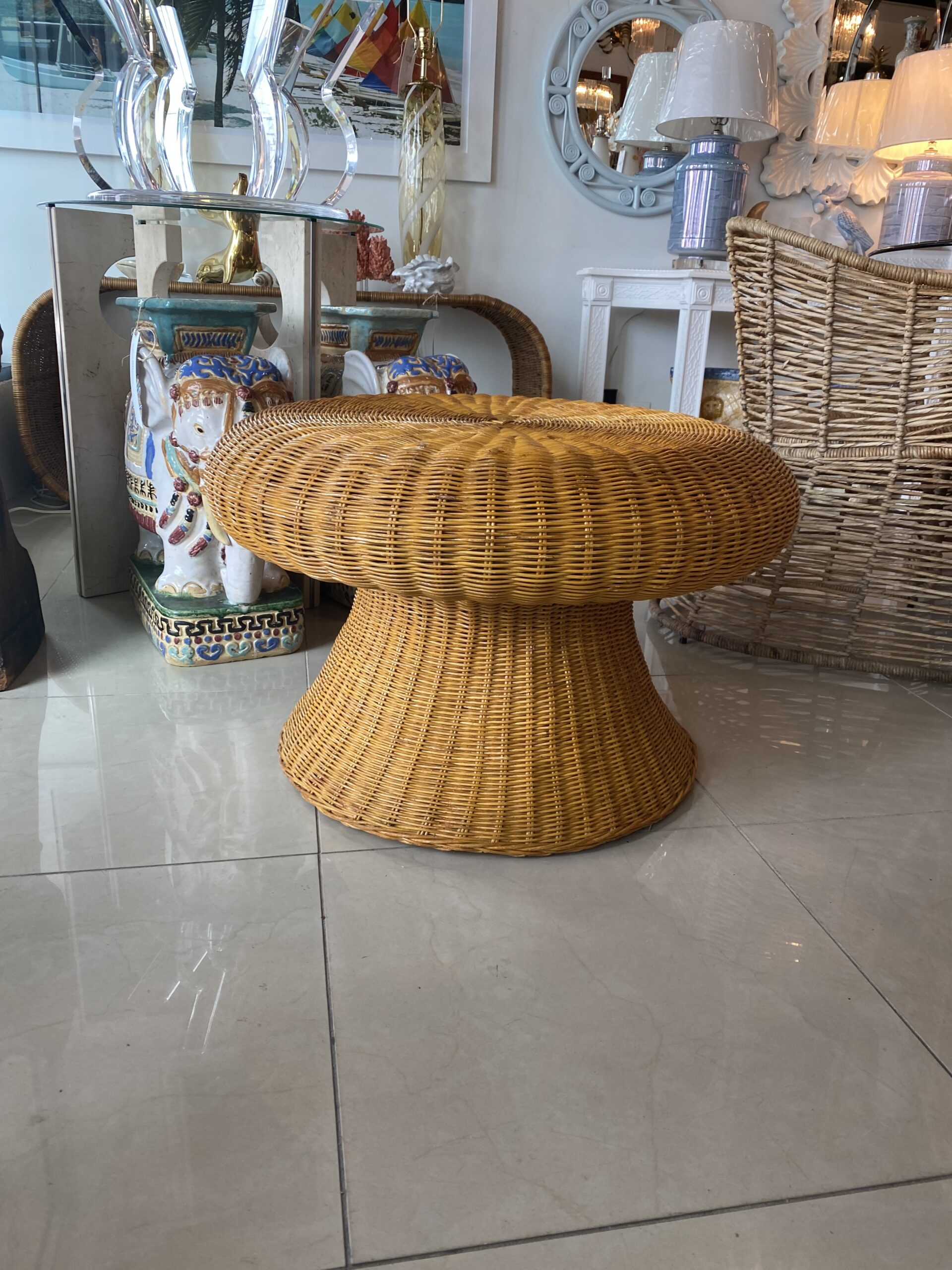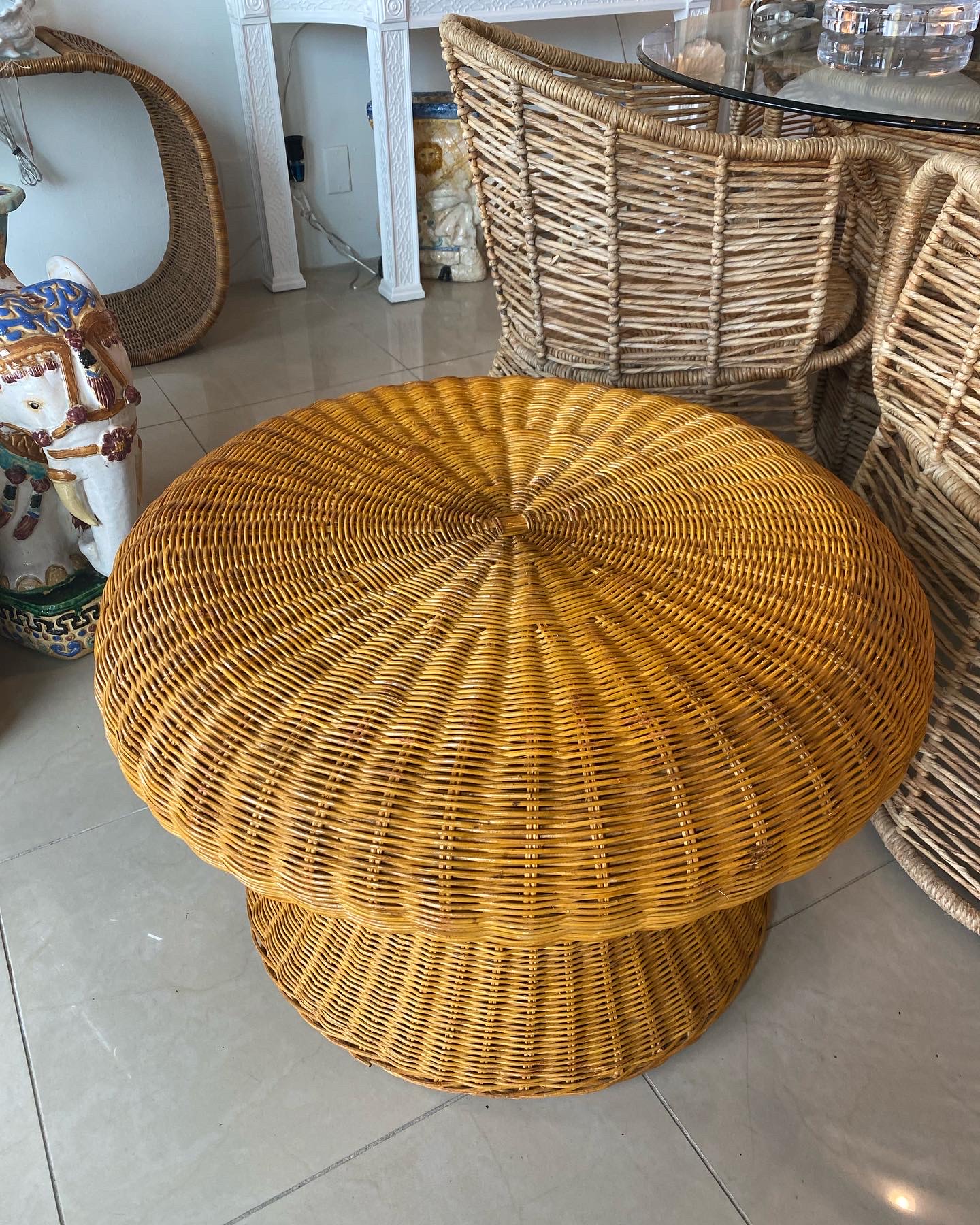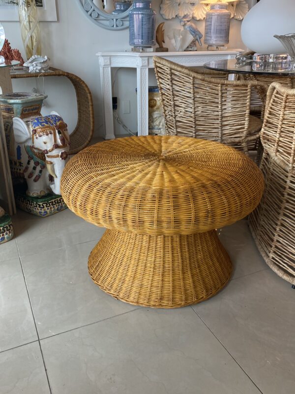 Lovey vintage wicker coffee table in the shape of a mushroom. Mo damage to wicker. You could also add a glass top to this.