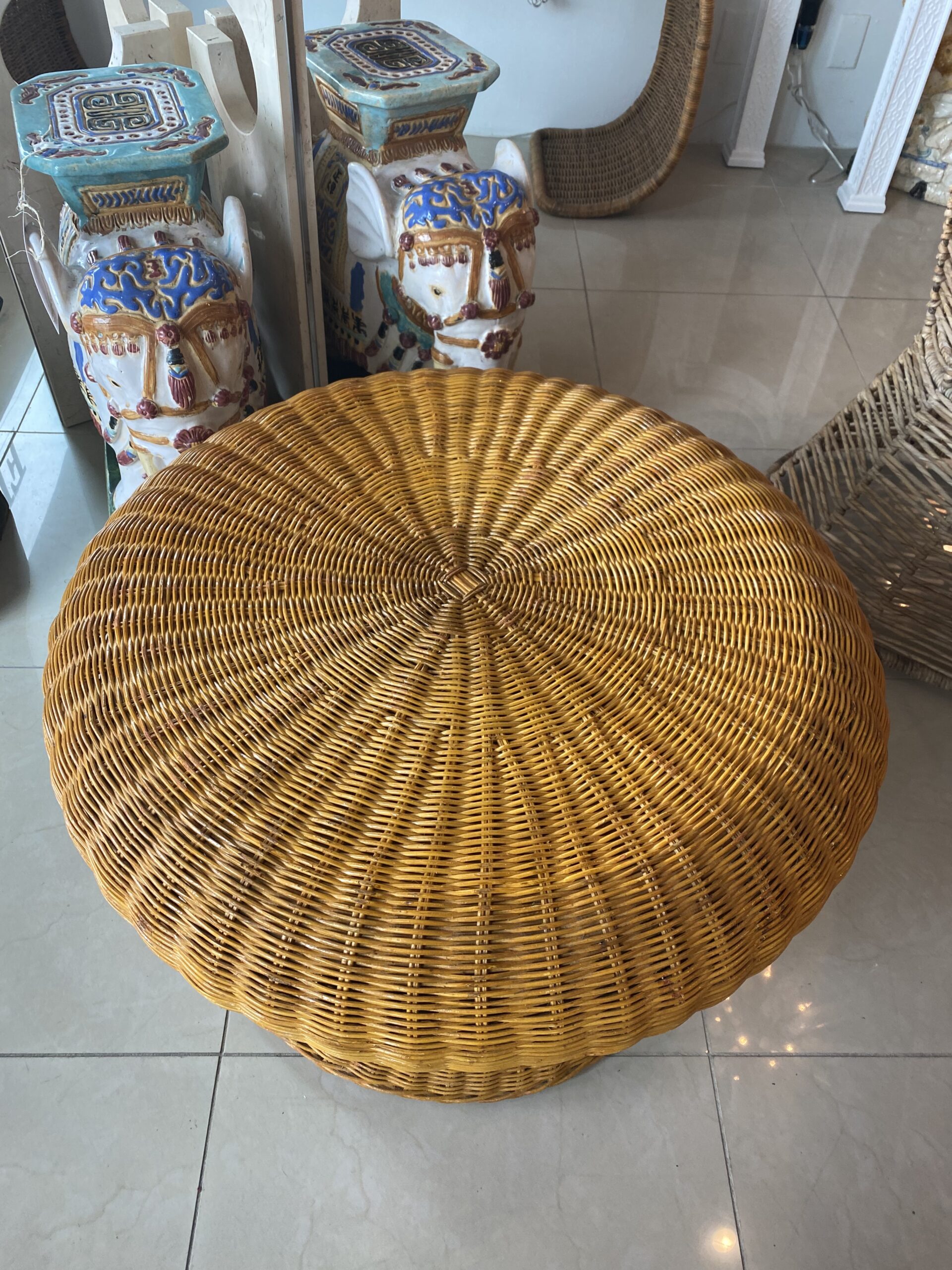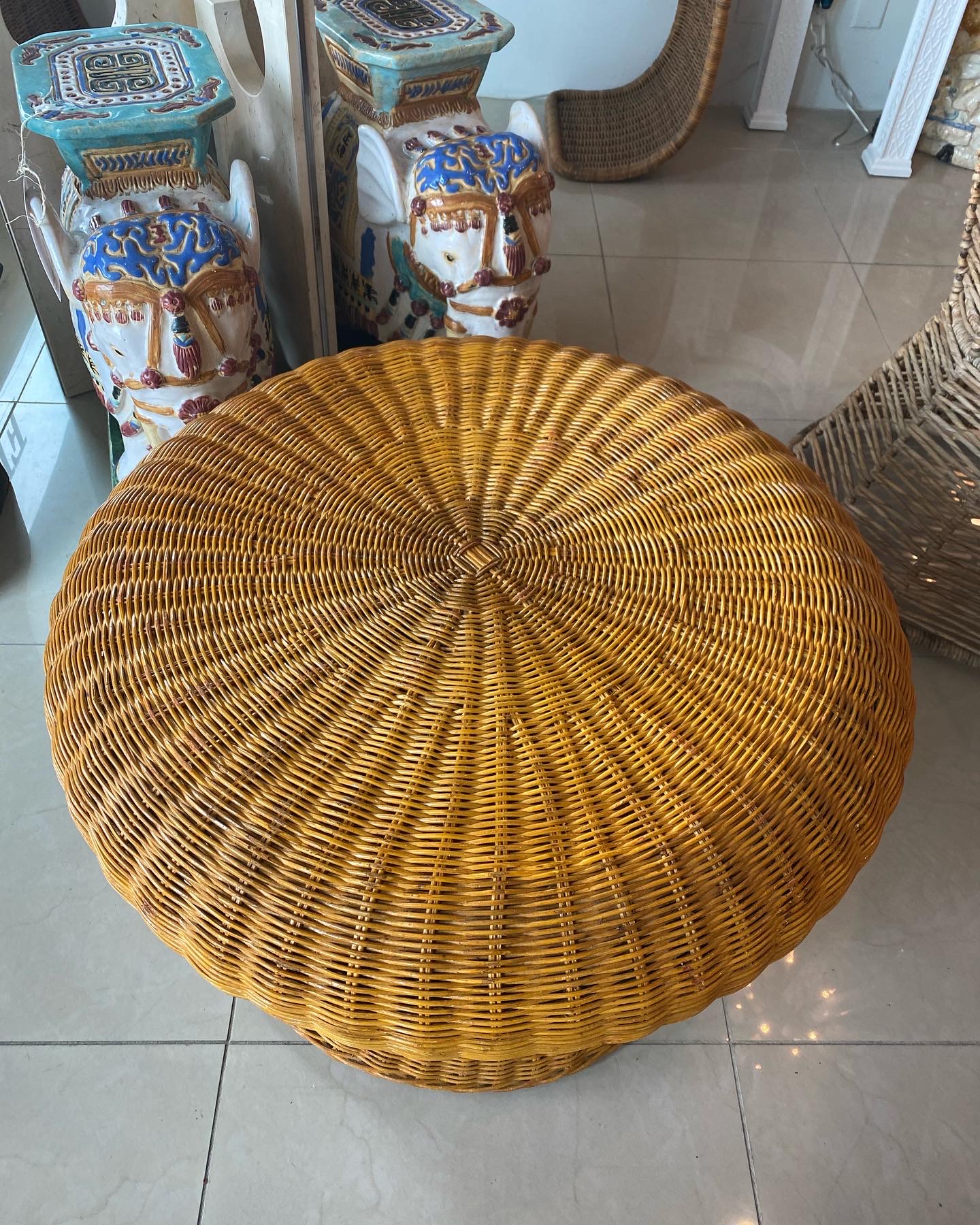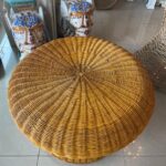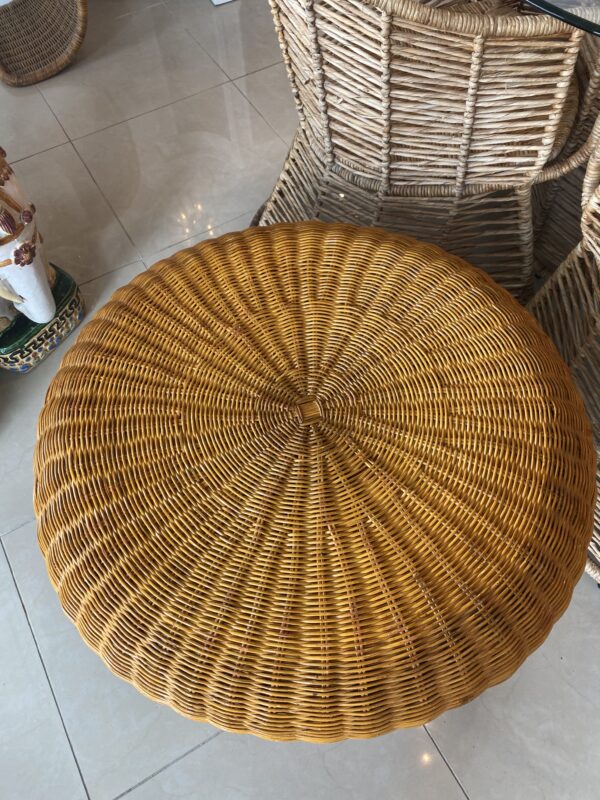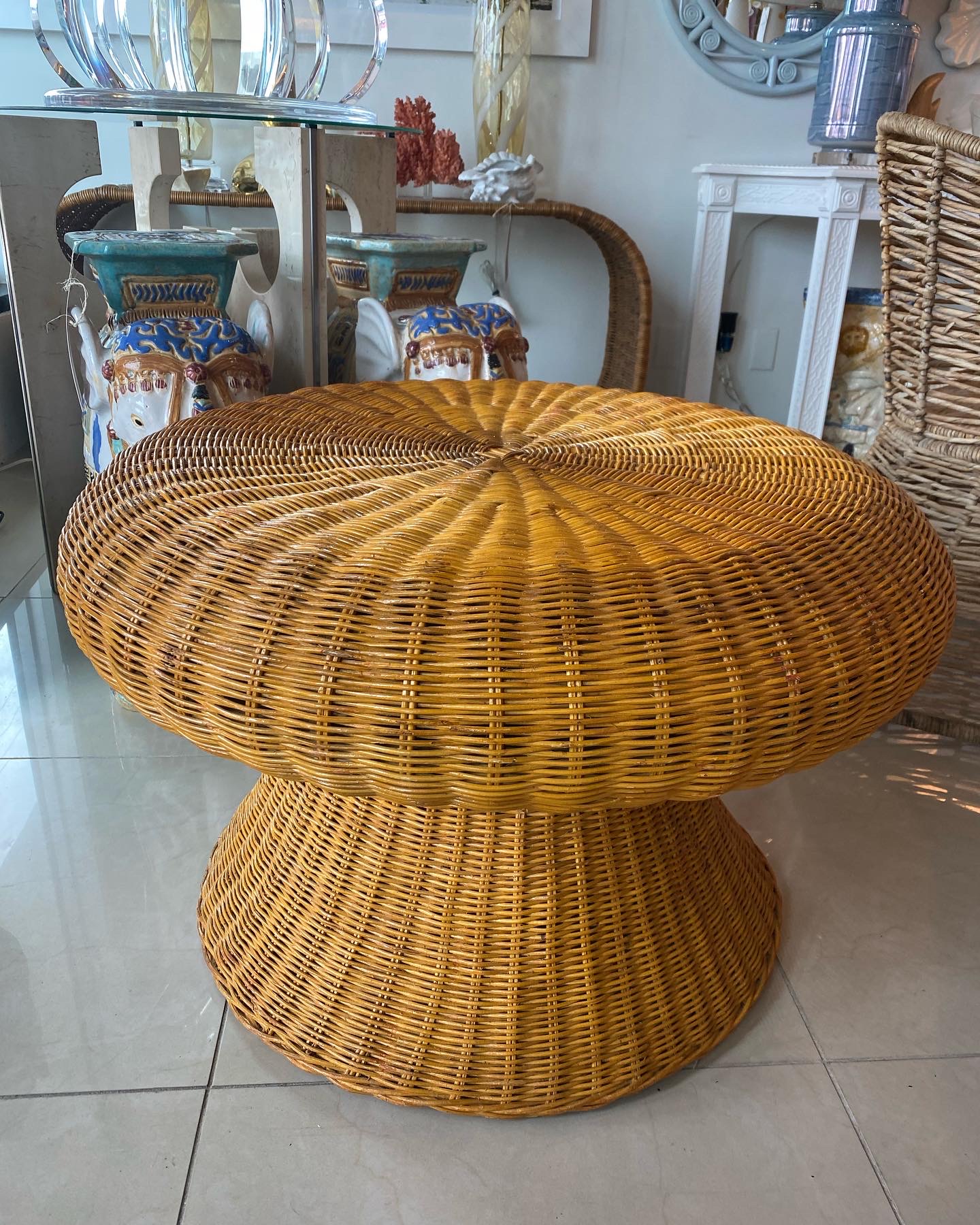 Lovey vintage wicker coffee table in the shape of a mushroom. Mo damage to wicker. You could also add a glass top to this.