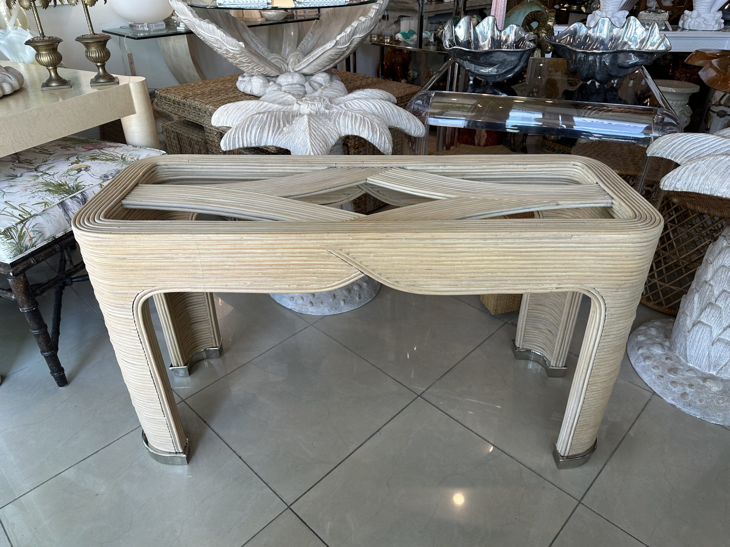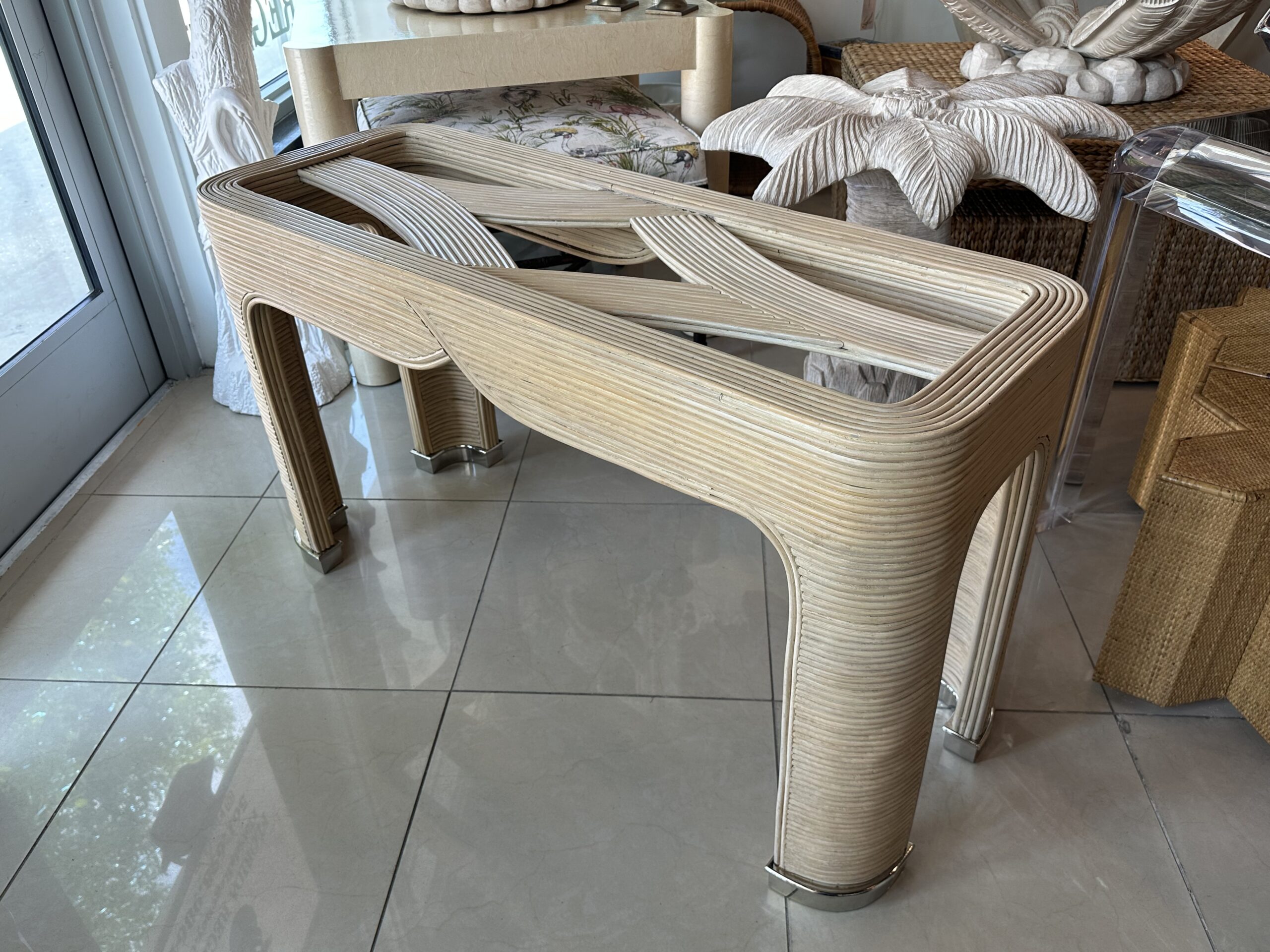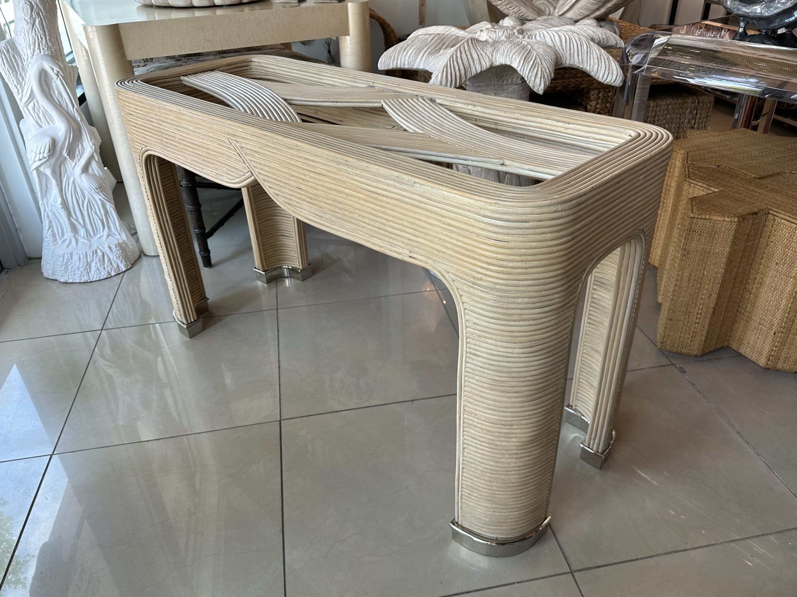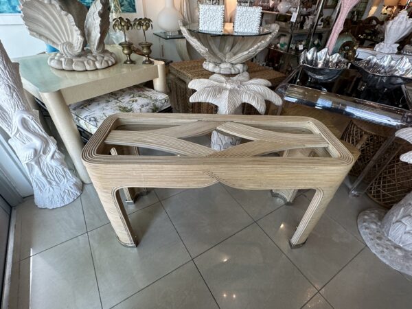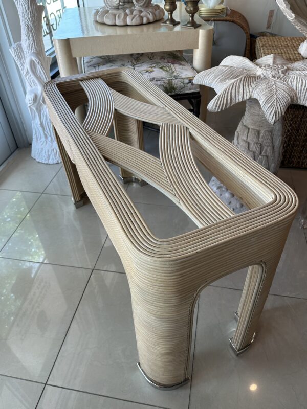 Vintage Palm Beach Pencil Reed Rattan Bamboo Console Sofa Table Brass Feet