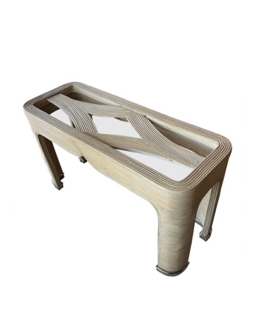 Vintage 1970s pencil reed rattan console sofa table with glass top insert. Original natural finish. Brass feet have been polished but may have patina. Dimensions: 48 L x 18 D x 27.5 H