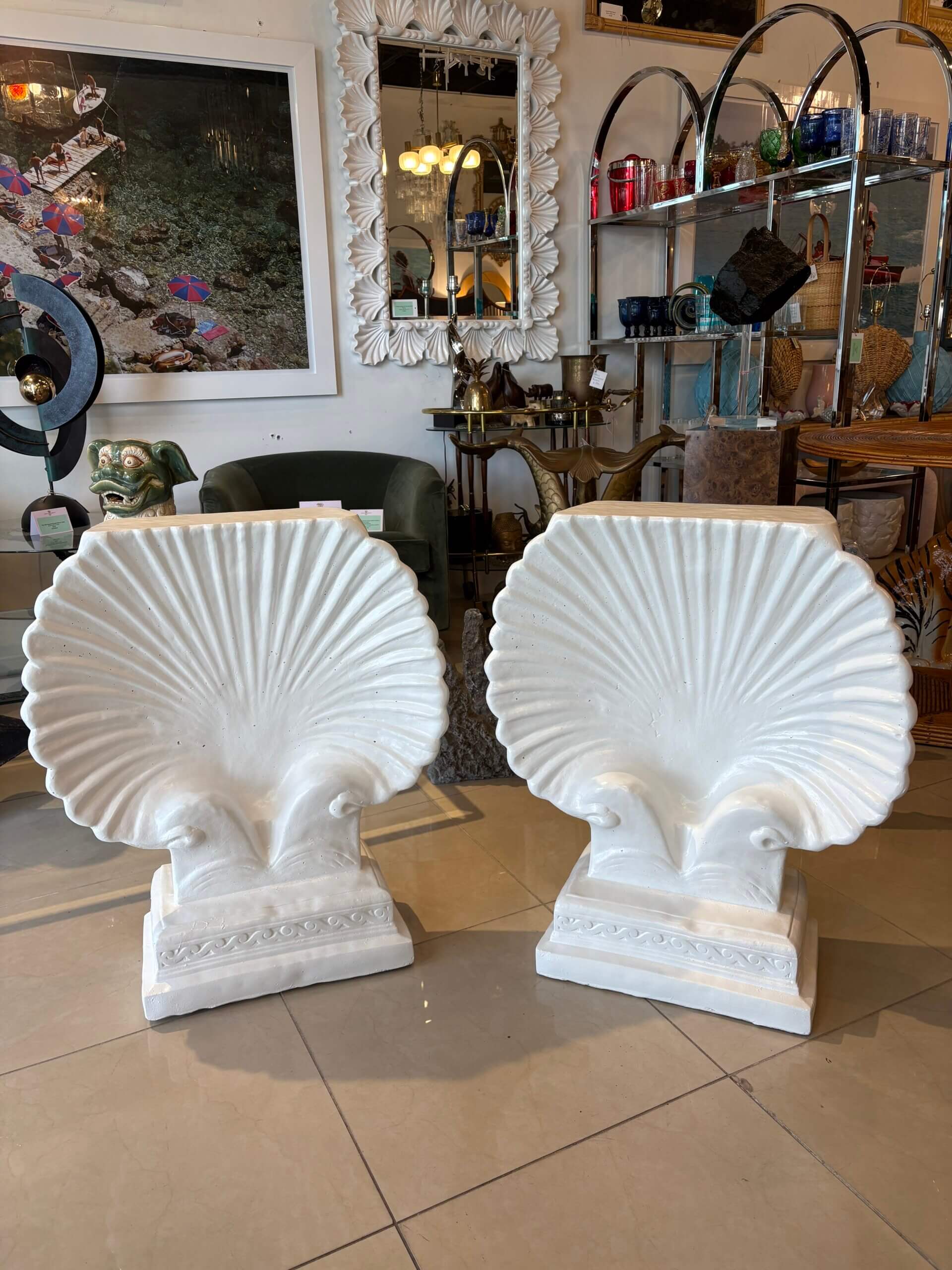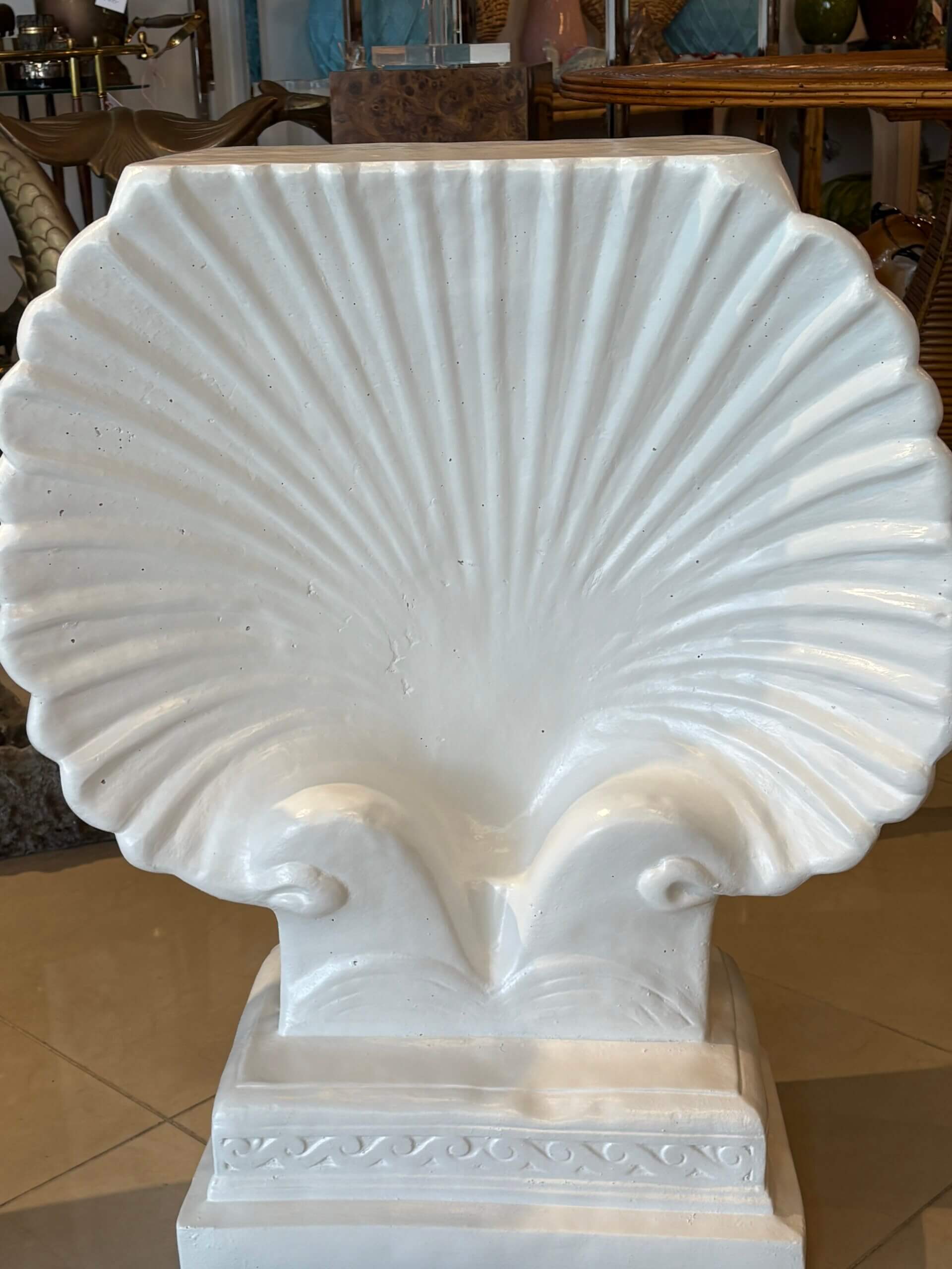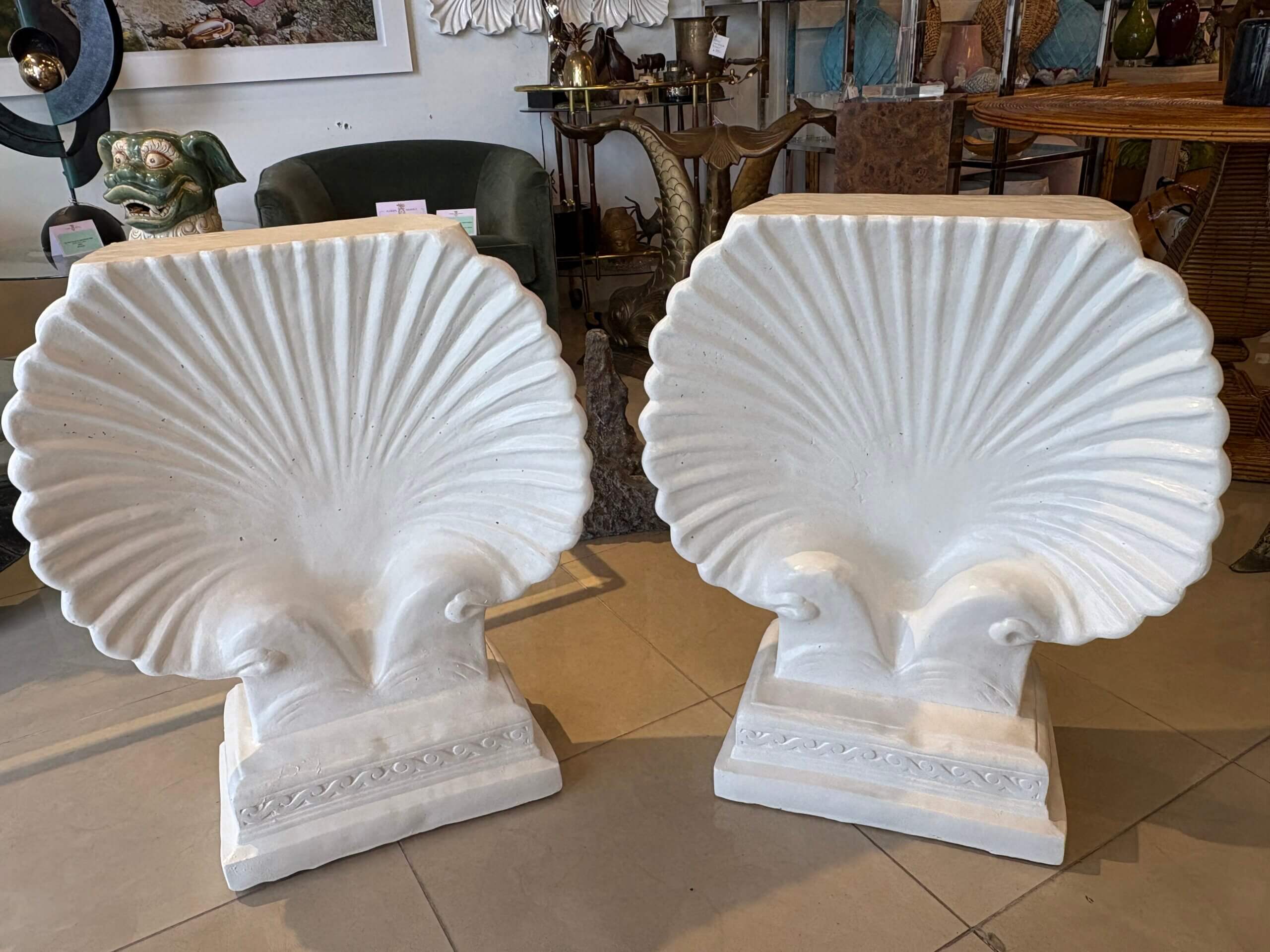 Vintage Palm Beach pair of scalloped clam sea shell seashell concrete dining table bases. These weigh approx 150 lbs each. These have been newly painted in a satin white. You can add your wood, glass or stone base to these. Matching console table base available. Dimensions: 29.5 H x 10 D x 25 W.