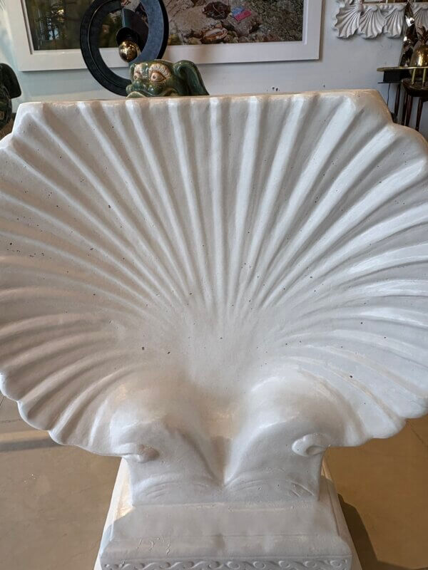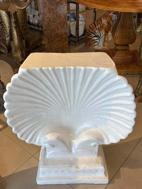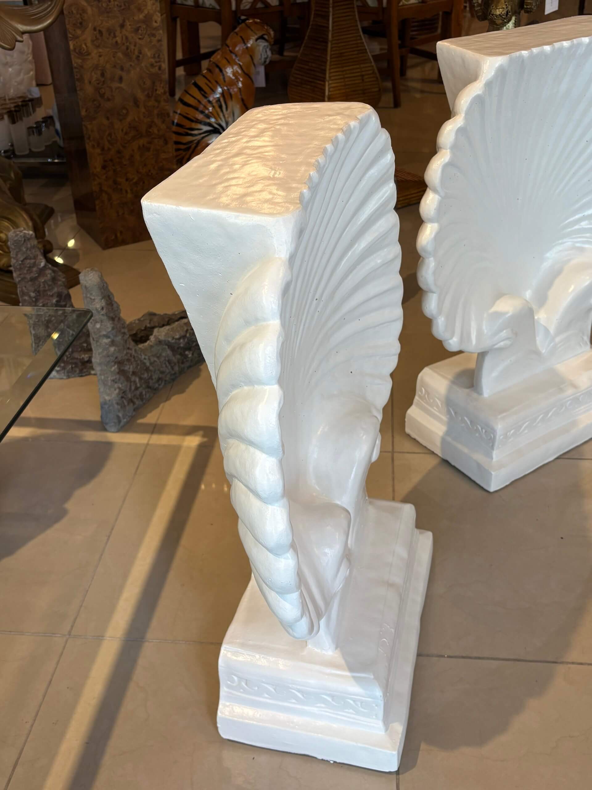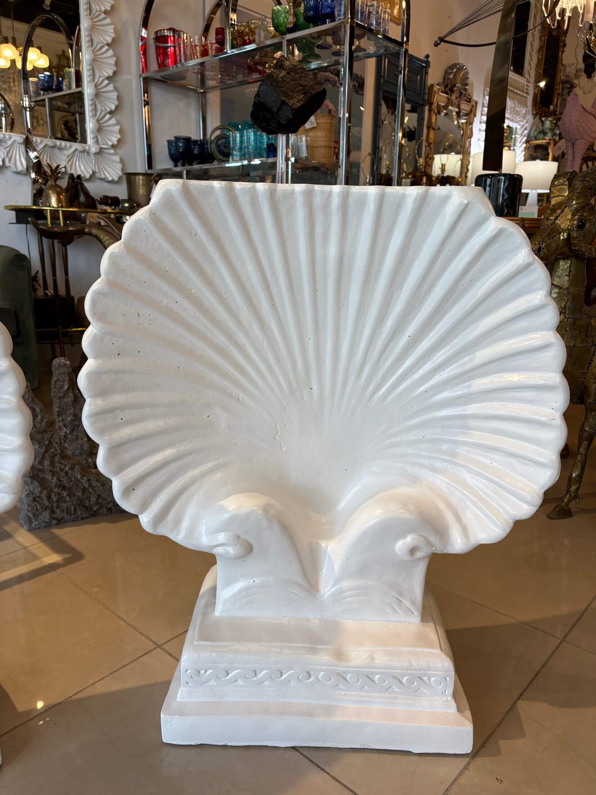 Vintage Palm Beach pair of scalloped clam sea shell seashell concrete dining table bases. These weigh approx 150 lbs each. These have been newly painted in a satin white. You can add your wood, glass or stone base to these. Matching console table base available. Dimensions: 29.5 H x 10 D x 25 W.