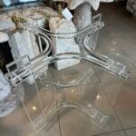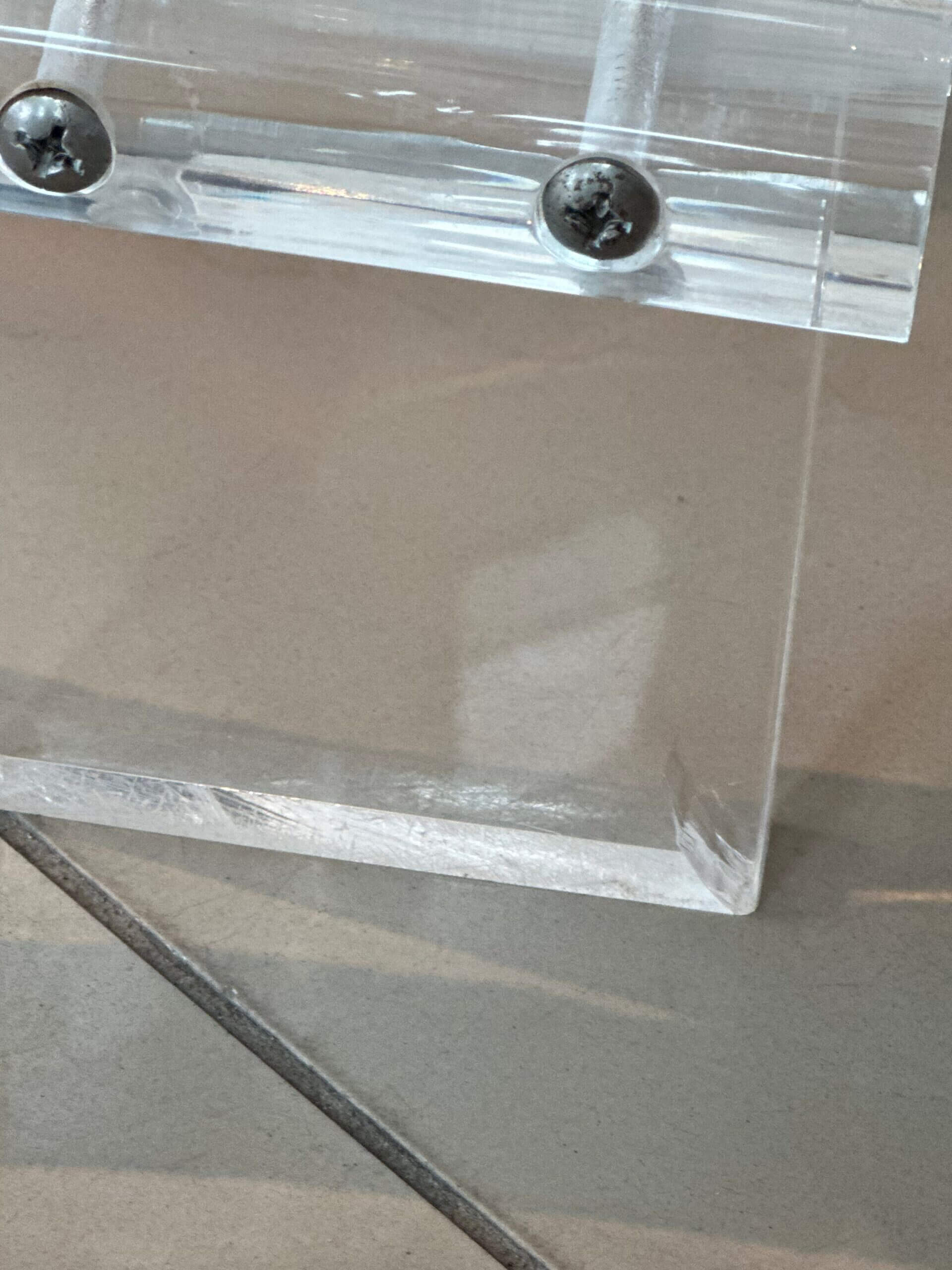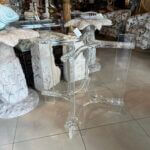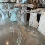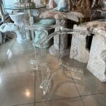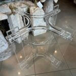 Vintage lucite table base. This can be used as a dining table base, game table base or a center/entry table base. You can add your top of glass, marble, wood, etc. This has been polished, There is a small chip and inclusion on the bottom of the leg (pictured close up) Dimensions: 28 H x 31 D.