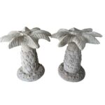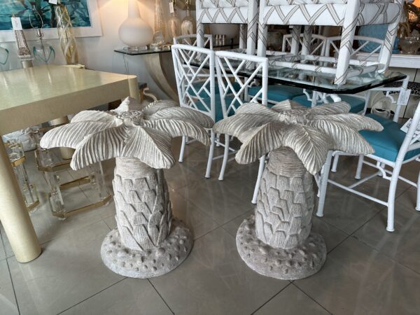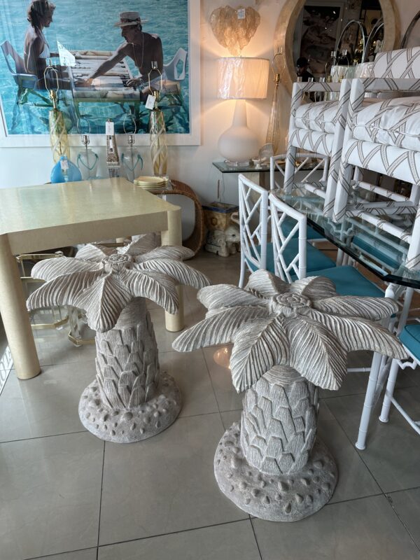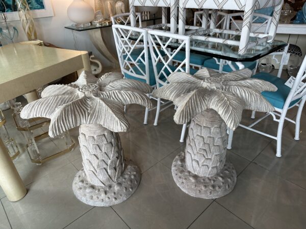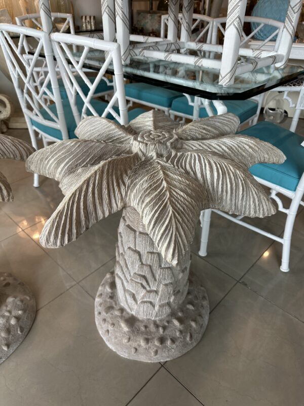 Amazing vintage plaster palm tree table base. These are being sold individually with option to buy one or two. This can be used as a single base with a round top for a dining table, game table or center, entry table. As a pair it can be used as a large dining table, rectangular or oval large glass. Glass not included. No chips or breaks. Dimensions are 28.5 H x 30 D.