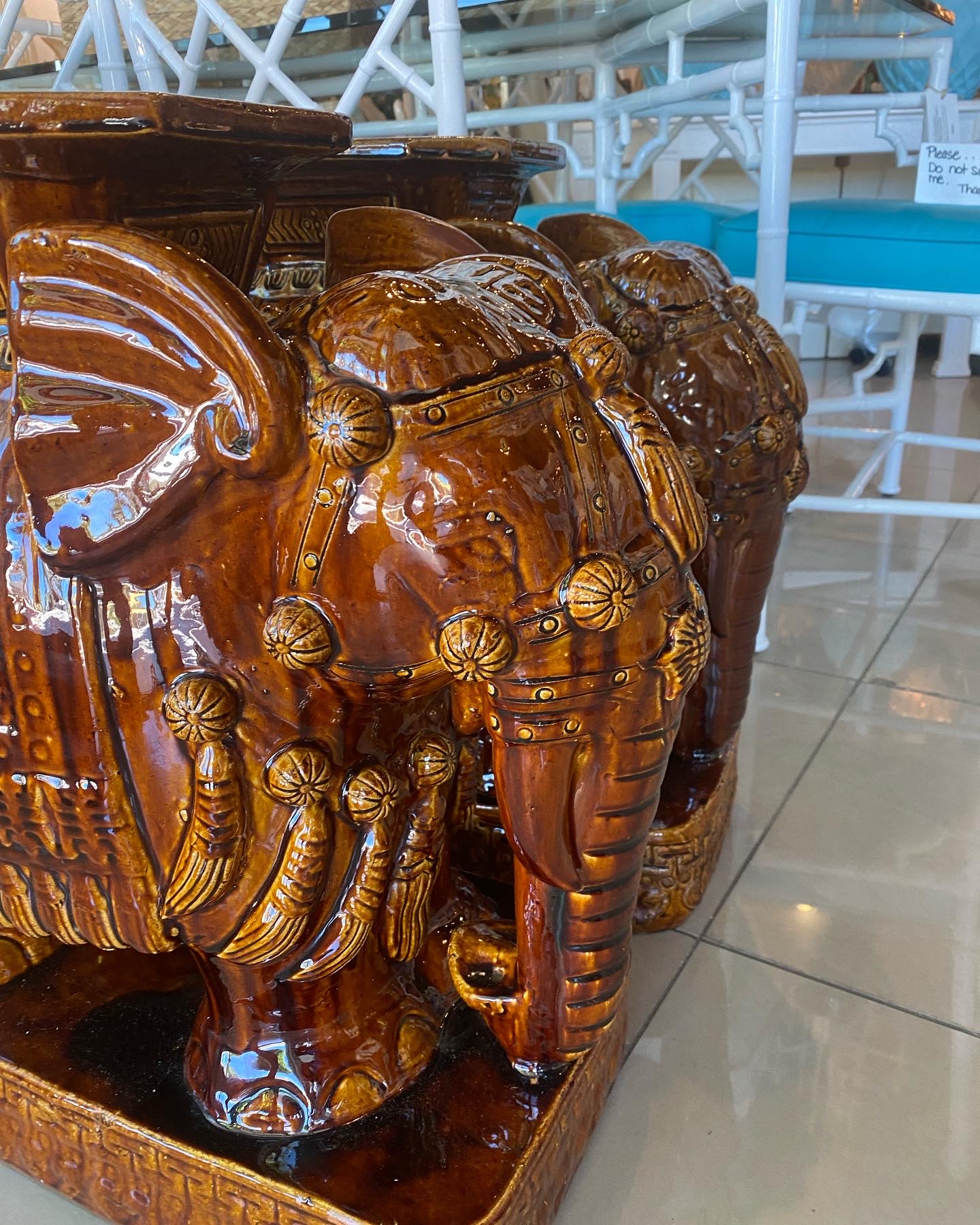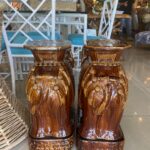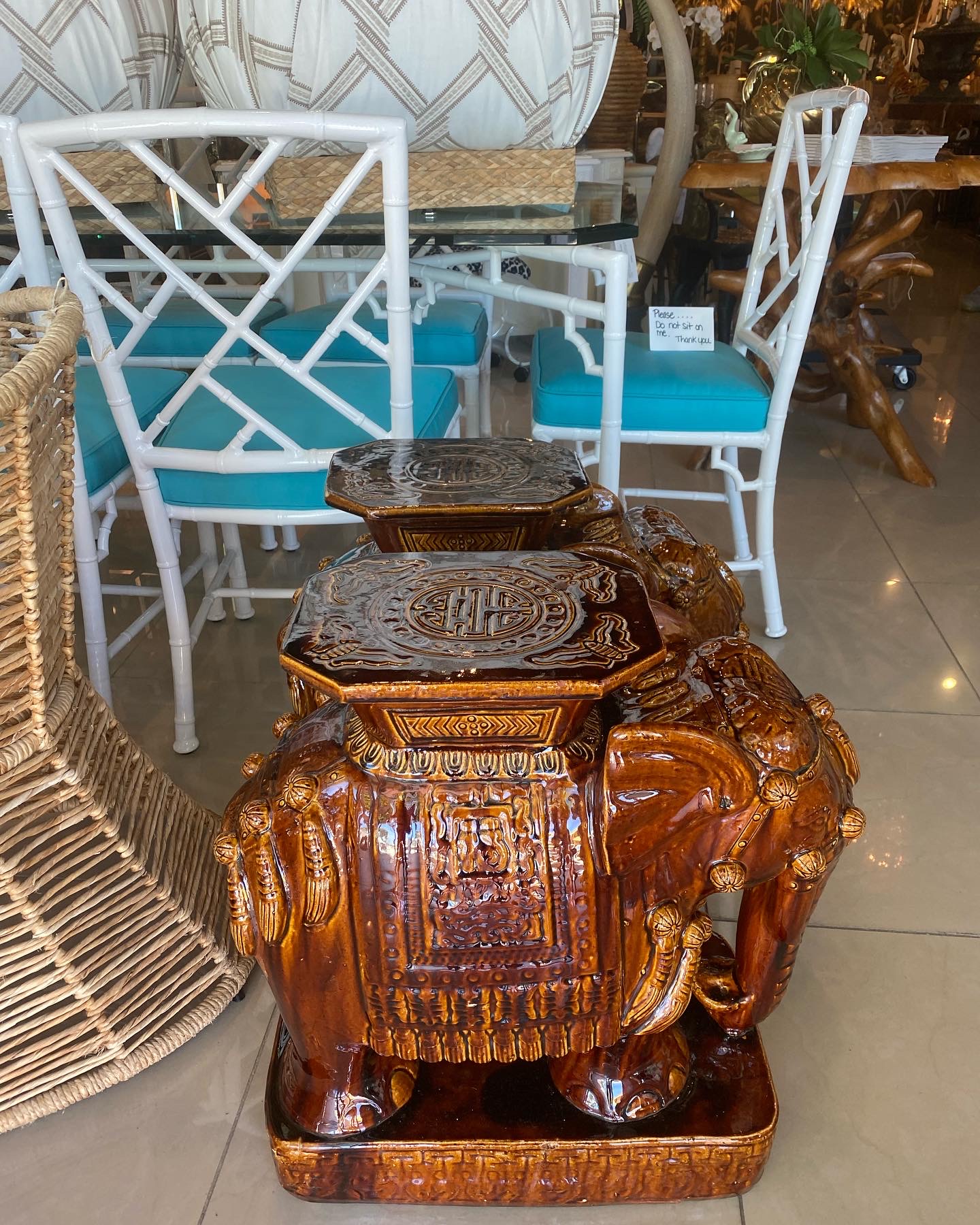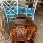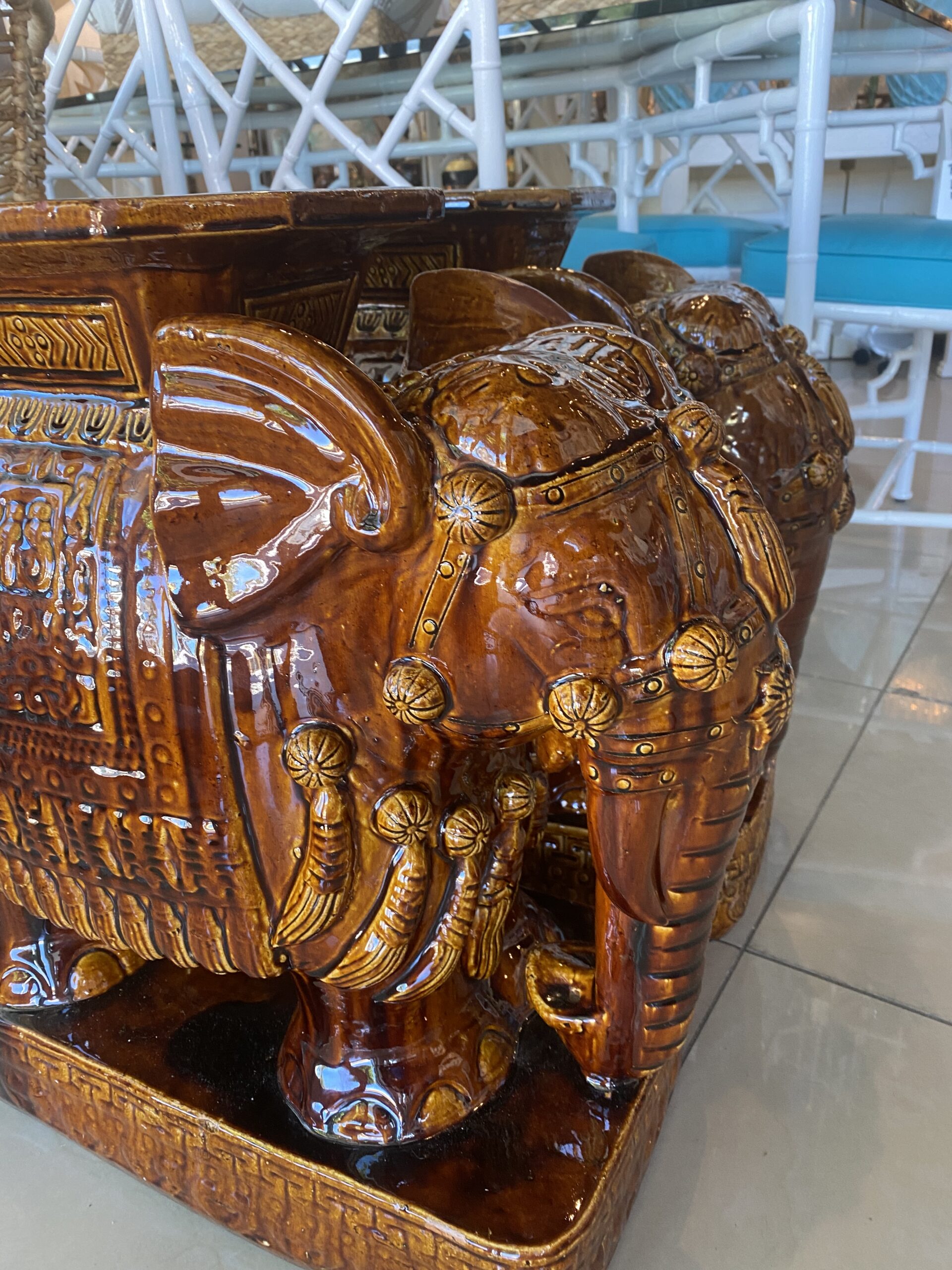 Vintage Pair Brown Glazed Elephant Garden Stands Stools Benches Drink Tables