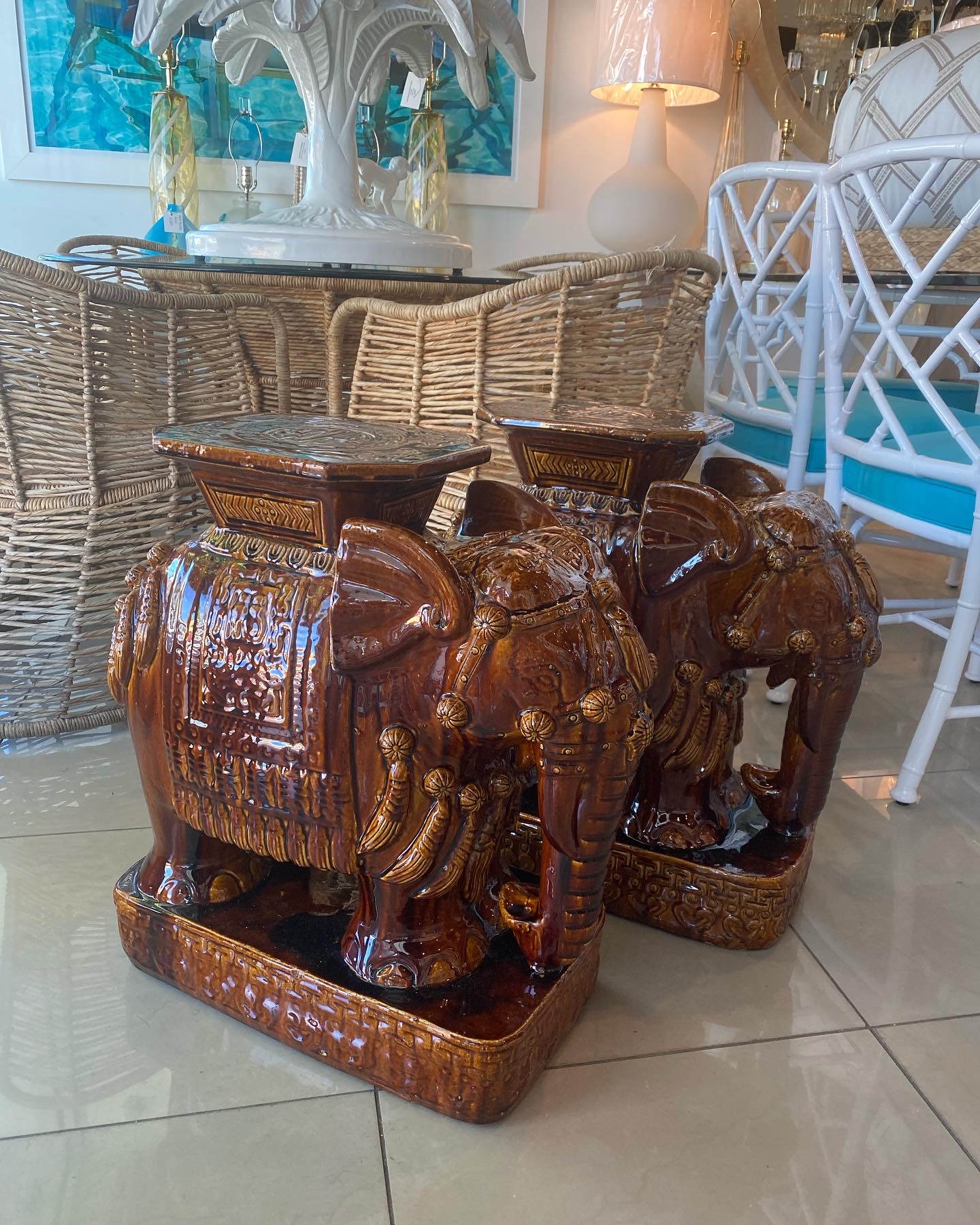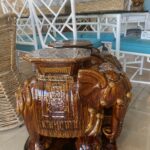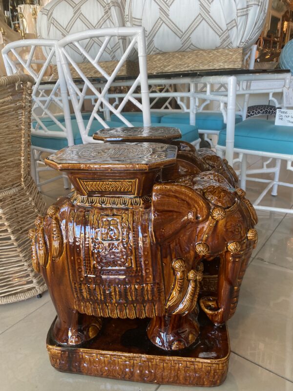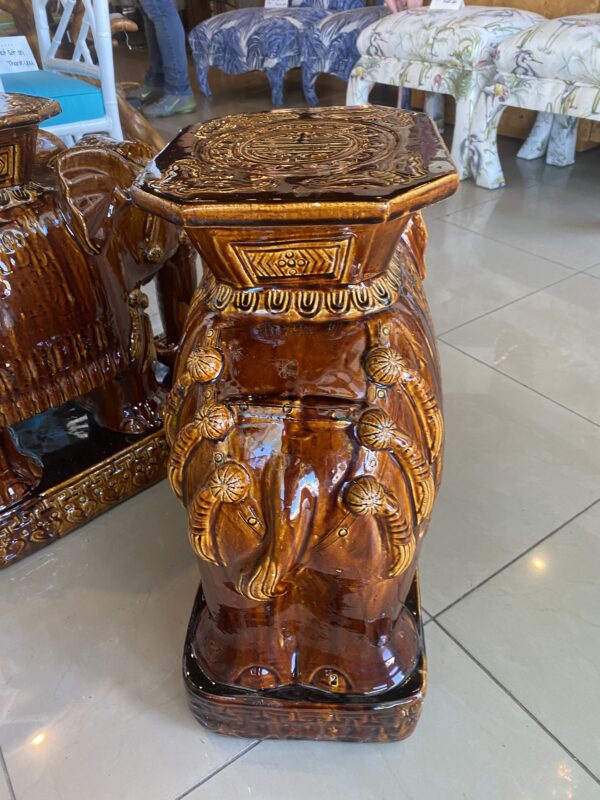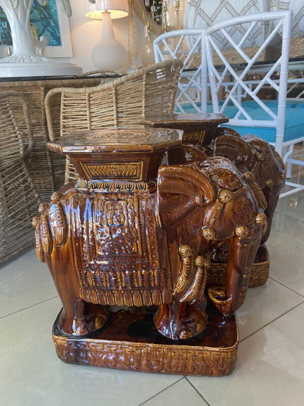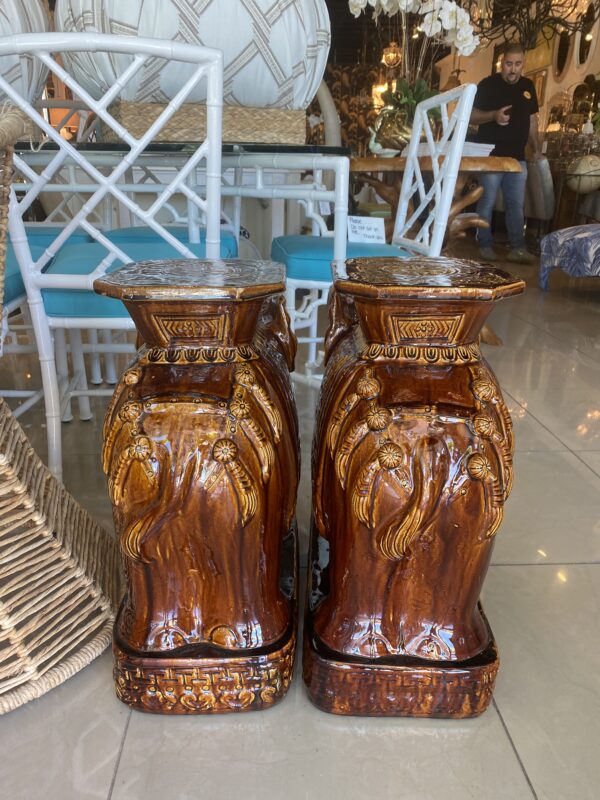 Lovely pair of vintage brown glazed elephant garden stands. Used as benches, stools, stands, side tables, end tables or drink tables. No chips or breaks. Dimensions: 23 H x 10 W x 20 D.