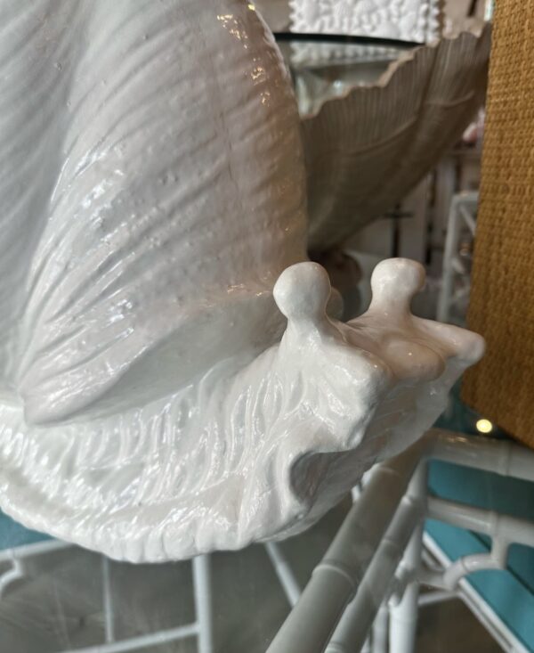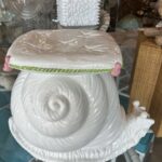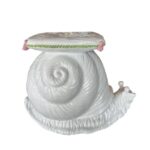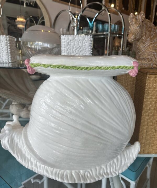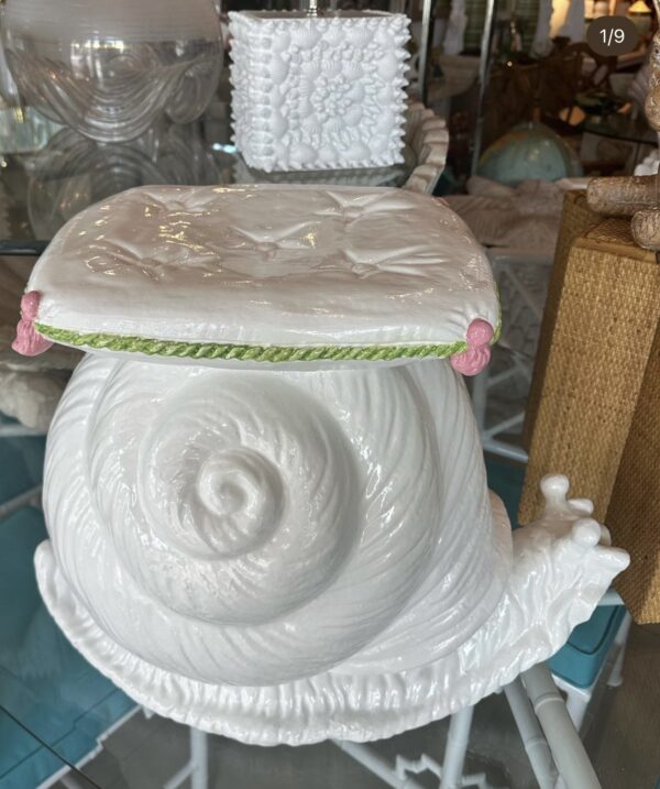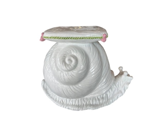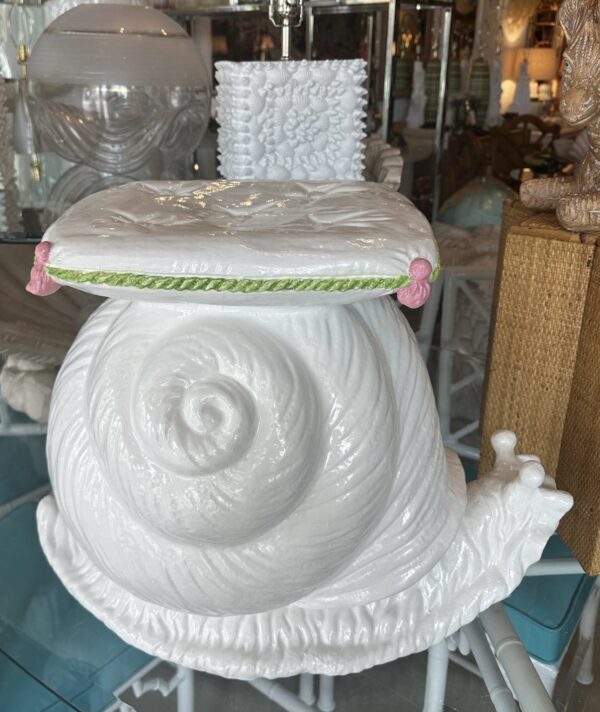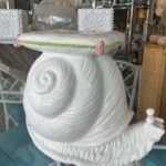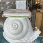 Vintage 1970s snail garden stand stool, stand, end or drink table. This is made from some sort of composition. Hand Painted. Dimensions: 18 H x 24 W x 14 D.