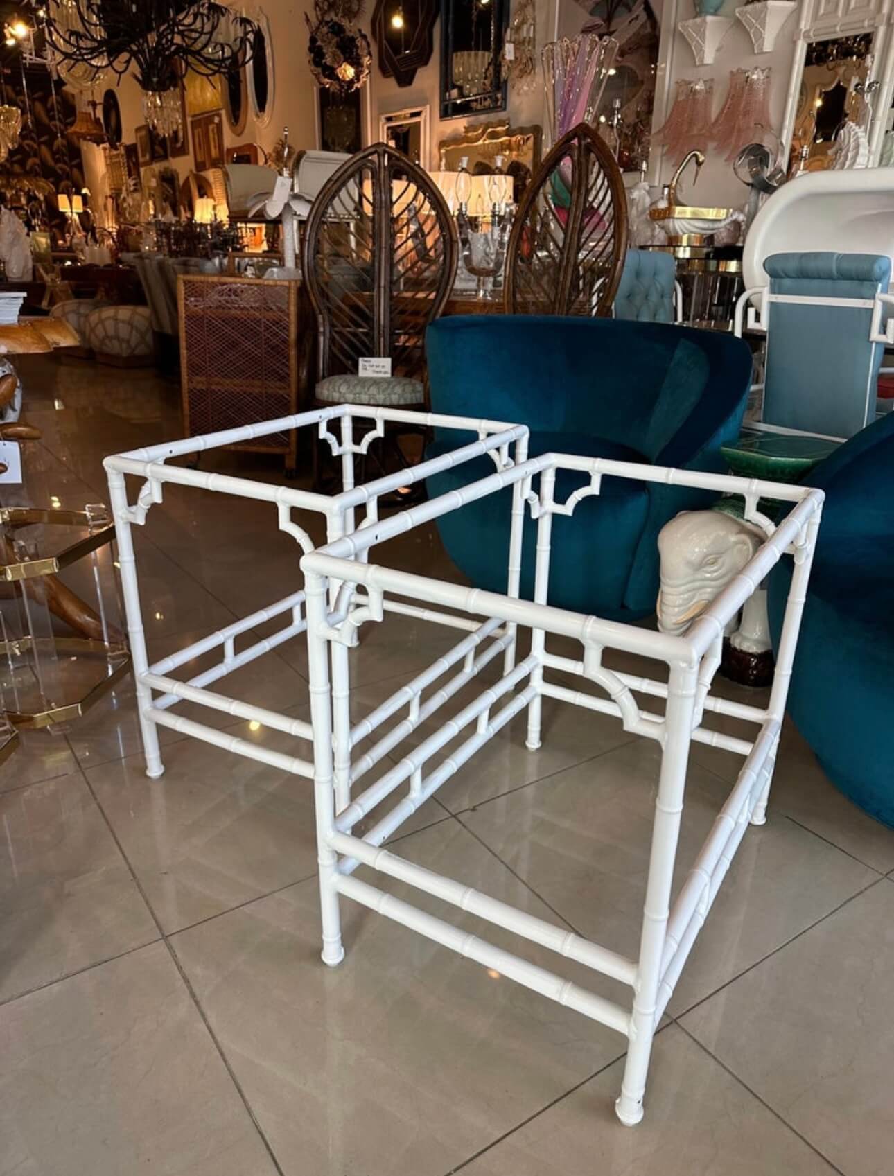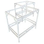 Vintage pair of faux bamboo metal side end tables. Indoor or outdoor, patio. These have been newly, professionally powder-coated. There are two glass shelves, top and bottom. The glass pieces will be newly cut prior to shipping or pickup. These have been completely restored to perfection! I do have other matching pieces including sofas, loveseats, club chairs, coffee tables. Dimensions: 26 D x 18 D x 24 H. Can be oriented either way.